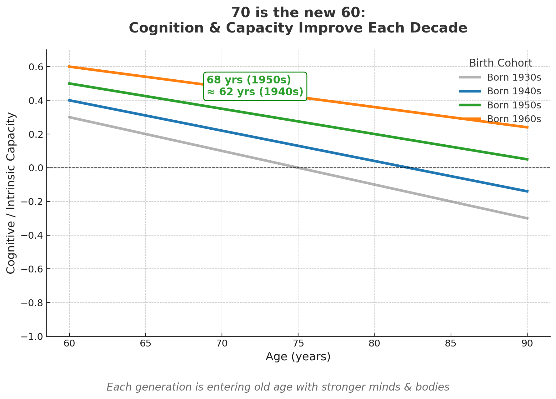 The good news as this trend analysis by John Beard and colleagues in Nature Aging [1] shows is that with each new generation measured in decades, the rate of loss of intrinsic capacity has been reducing, which means that the later people are born, the better they maintain intrinsic capacity when they age. For example, a person born in the 1960s has better intrinsic capacity than someone born in the 1930s when you compare them when both reach age 70. The graph below created with ChatGPT’s help shows this well. The reasons are multifactorial, but by and large are due to better health outcomes, which in turn are due to improved socio-economic conditions, structural and other interventions and improved healthcare delivery. We are living longer and we are living better…with guides like atmasvasth we can do even better.