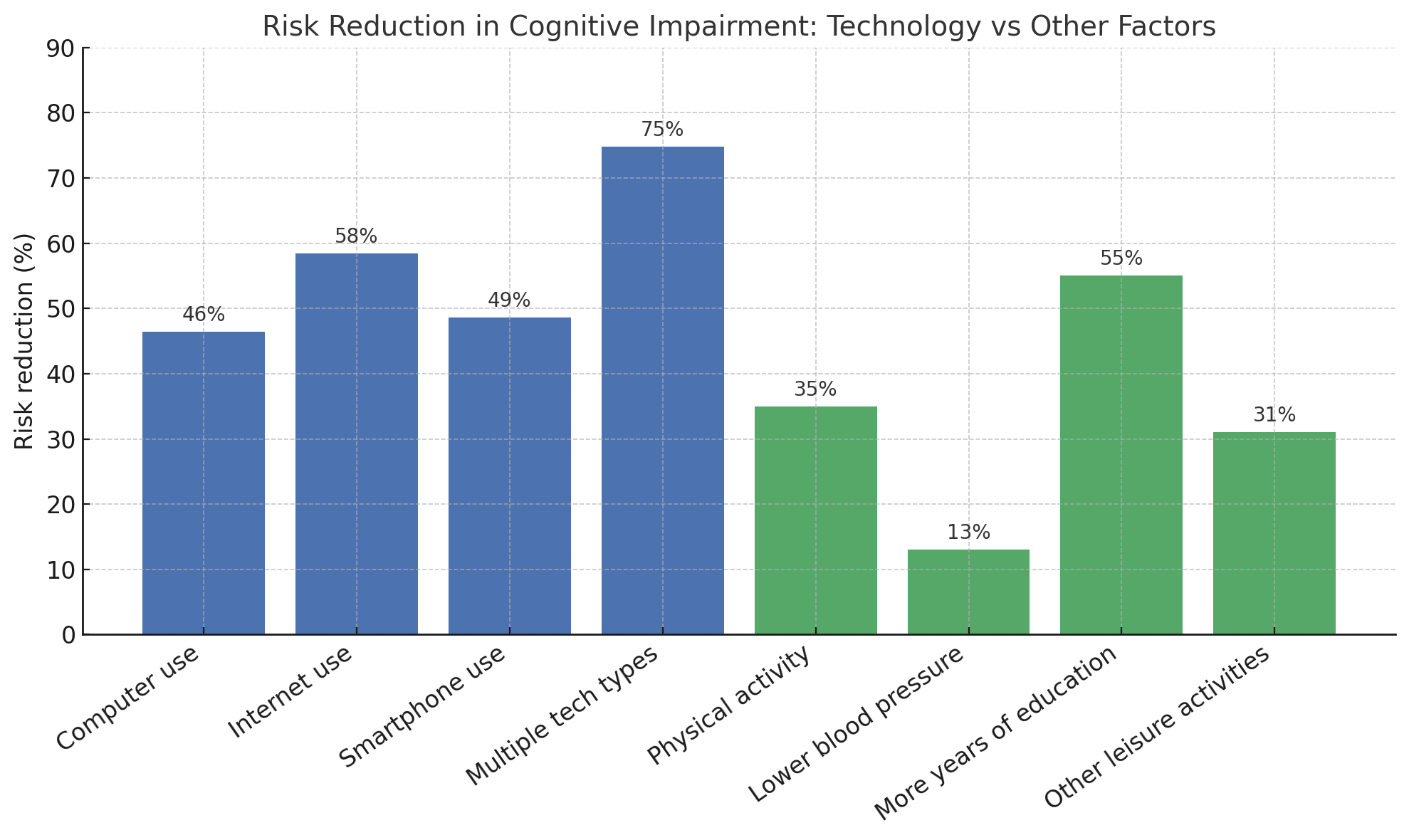 Even if these number seem a little stretched, and even if the risk reduction were to be half of what is stated in the paper with all the limitations of a meta-analysis and the limitations of the original studies, it tells that perhaps the use of technology in the elderly should be encouraged rather than discouraged and is likely to help them remain engaged and in turn help with reduced cognition loss.