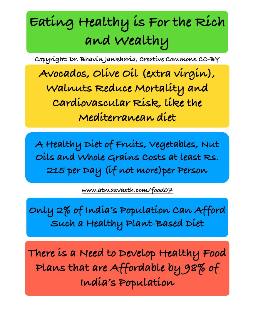 If you add the cost of avocados (Rs. 250/day), walnuts (Rs. 70) and olive oil (Rs. 40 for 1 tablespoon of extra virgin olive oil) into the mix, even if the olive oil is just for drizzling and not for cooking, less than 2% of India’s population would be able to afford healthy fruits, nuts and oils. Two percent is 28 million or 2.8 crores people (Mumbai and Ahmedabad combined) who can afford a Western “healthy” diet. No wonder superfoods are truly super-rubbish for 98% of India’s population.