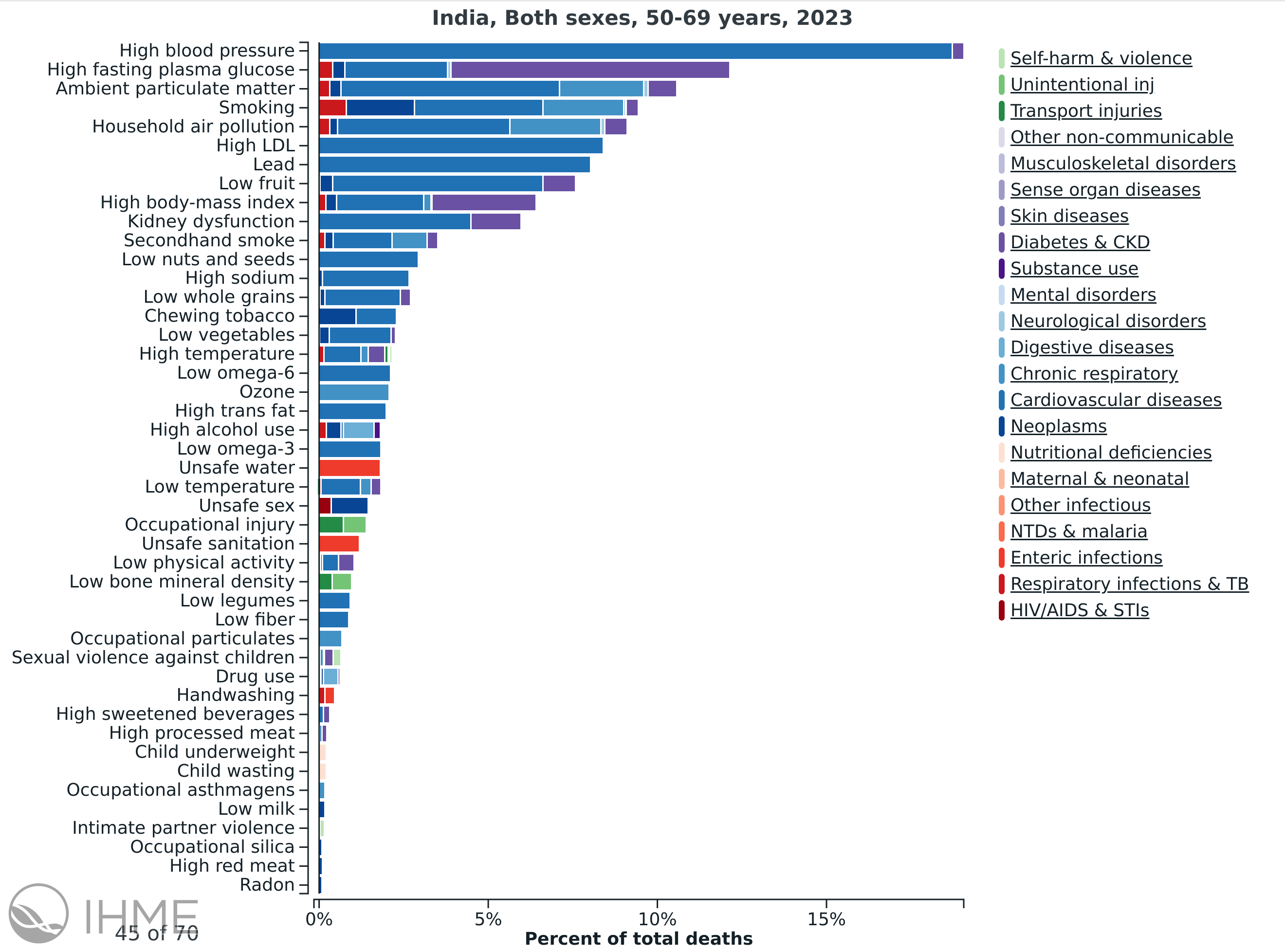 If you then take out air pollution, over which we do not have control, then managing high blood pressure, high fasting plasma glucose and high LDL levels would take care of 38% of the country’s risk of death and not smoking would take that to 47%. Imagine if we could reduce the risk of death by half.