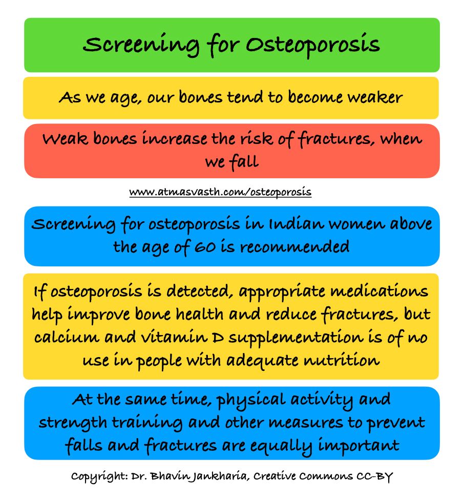 If you are a woman above the age of 60 in India, you should get one screening bone density measurement by DXA to diagnose osteoporosis. Below the age of 60 or if you are male, you should get the test done only if you or your physician find that you have specific risk factors for osteoporosis. If you are found to be osteoporotic, you may be prescribed long term medication (bisphosphonates, etc). Physical activity and strength training and taking steps to prevent falls are equally important measures that help reduce the risk of fractures and in turn help you live long, healthy.
