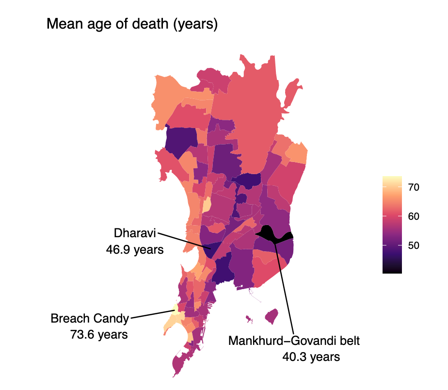 In 2015, a person living in Mankhurd-Govandi, in the slum area had an average life expectancy of just 40.3 years, compared to a person living in Breach Candy, where it was 73.6 years, a difference of more than 30 years. Dharavi had a slightly better life expectancy by 6 years over Mankhurd-Govandi, which is not saying much. While things have improved because the life expectancy improves every year, except for a slight downward blip during Covid, clearly it matters where you live in Mumbai, because even if the overall life expectancy improves in every PIN code, the disparity does not change.