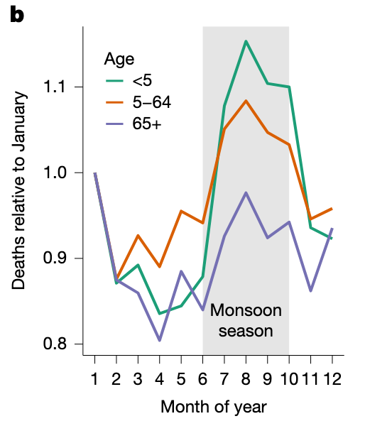 Within any year, the deaths are higher during the monsoons than any other period, including hot summers, as the 2nd graph shows.