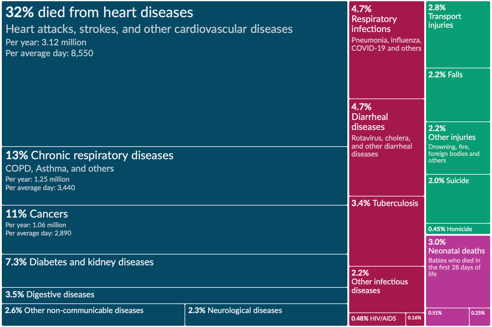 Take a look at the IHME treemap of how Indians died in 2023. Transport injuries (the large majority of which are road accidents) accounted for 2.8% of all deaths in India — roughly 2.7 lakh deaths a year when you use the SRS-based estimate, or 1.73 lakh using the Ministry of Road Transport and Highways (MoRTH) police-reported numbers for 2023 [1]. Either way, road accidents are the 9th or 10th biggest killer in the country, ahead of falls, suicide, HIV, and any single individual cancer.