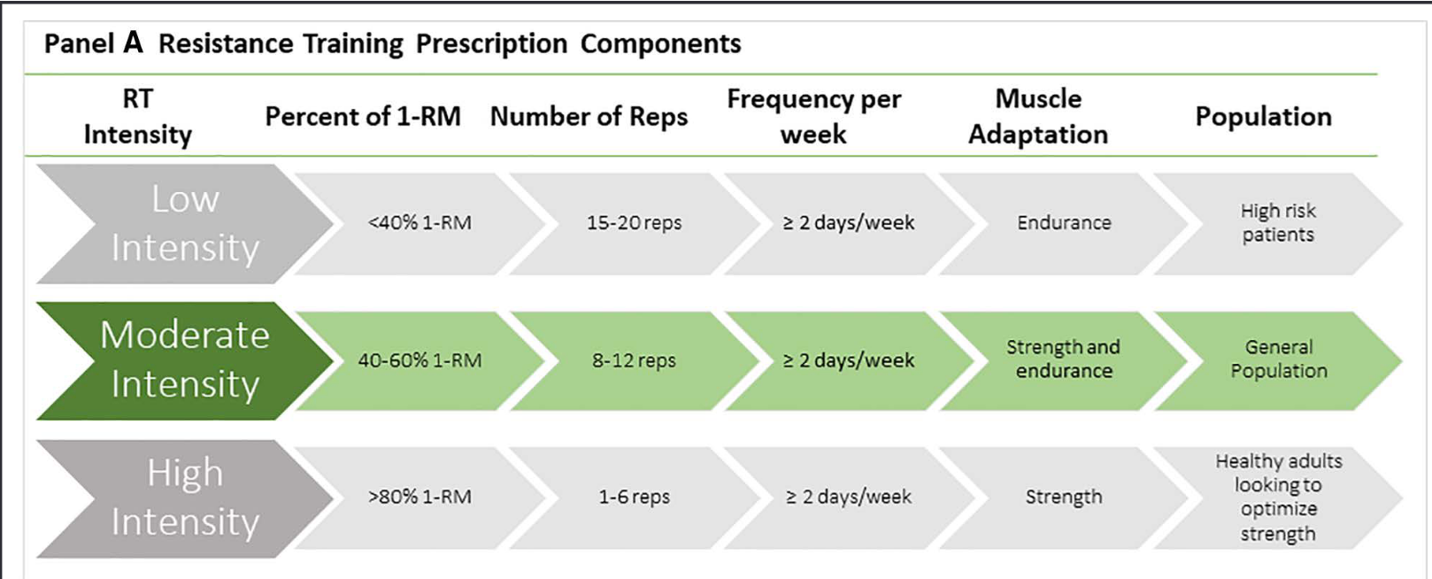 It is important to understand the concept of 1-RM. The maximum that a person can lift once is 1-RM. e.g. if you are doing a one-limb biceps curl standing, the maximum weight, say 20 kg you can curl just once is your 1-RM. 50% of that is 10 kg, which if you curl for 12 reps per set, then that is moderate intensity, whereas if you curl 16 kg for 3-6 reps, then that is high intensity (image from ref 3).