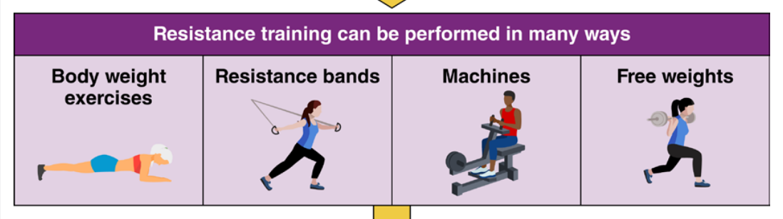 Resistance training is an exercise requiring muscle contraction against an external resistance or the body’s own weight to increase muscle mass and strength [2]. This includes exercises performed against our own body weight such as pull-ups, push-ups, or against gravity and bands, barbells or dumbbells (image from ref 3).