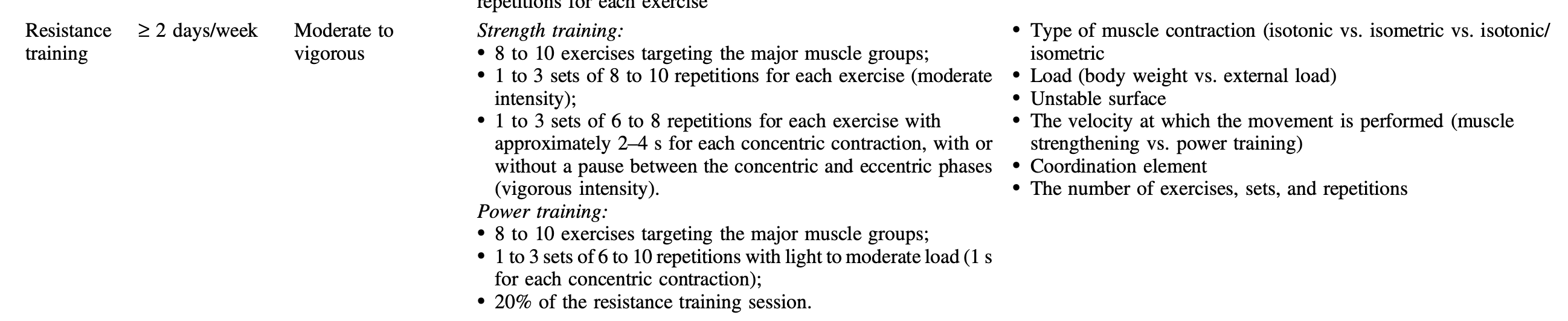 Resistance training, using body weight, machines, dumbbells, barbells or bands, targeting all muscle groups, is needed to build and maintain muscles, preferably supervised, at least twice a week.