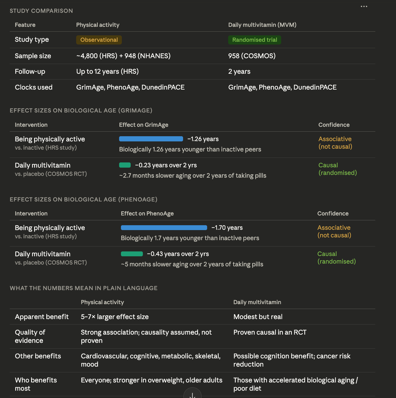 In brief, the numbers are striking even accounting for the fact that the PA studies are observational...physical activity reduces biological clocks far more than multivitamin supplements.