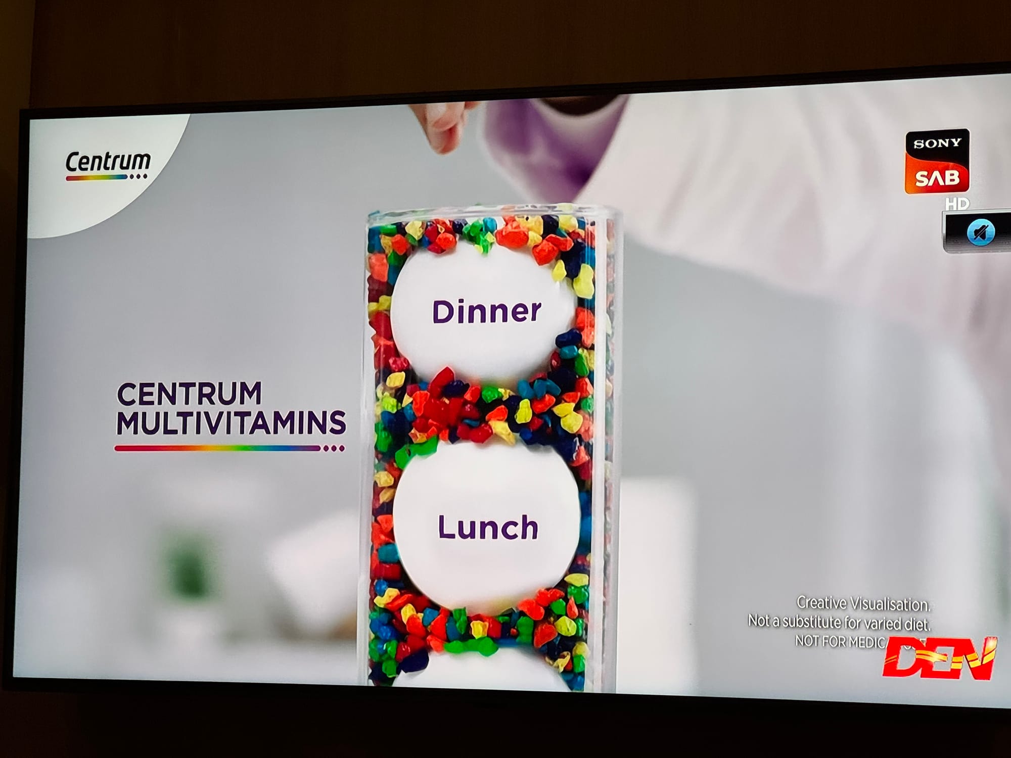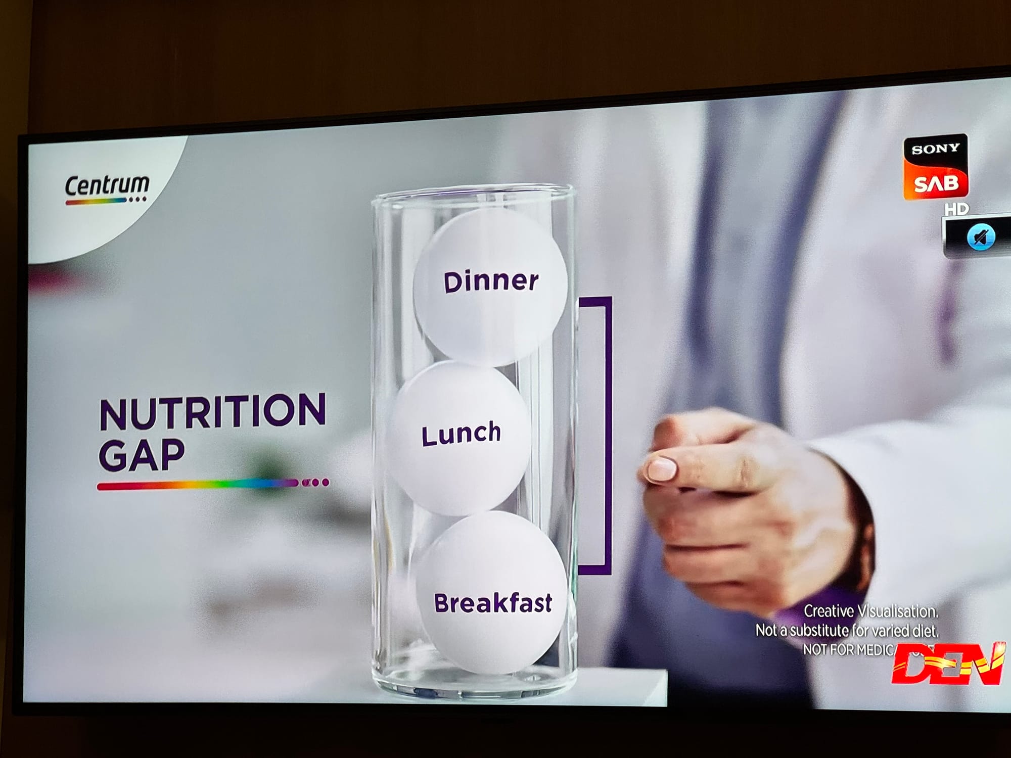 Most of last year, I kept seeing this grating ad on television during one of the popular Hindi television serials that is always on, in the background, during family dinner. There is a “health-coach” dressed in a white-coat to look like a doctor, who explains why we need to fill the gaps between breakfast, lunch and dinner with multivitamin supplements of a brand called Centrum, because in the “in-between” phase, it is assumed that our body is a leaky bucket for vitamins and minerals that needs topping up. Here are two stills from that ad.