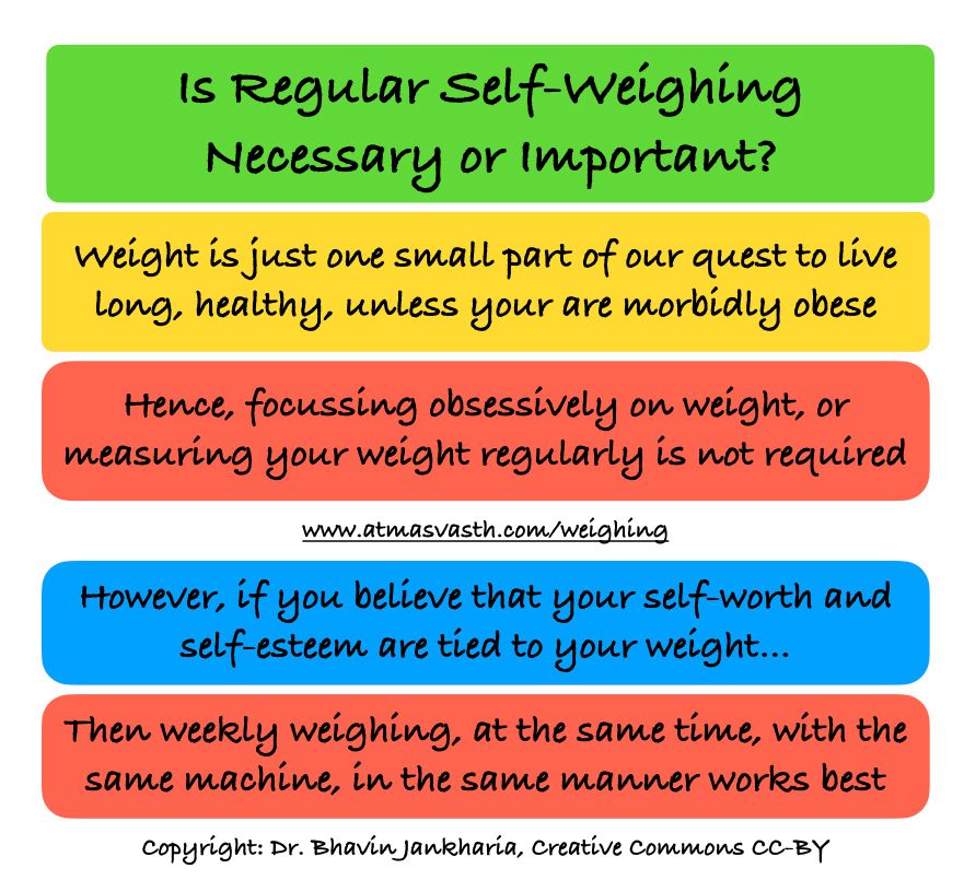 In short, you don’t need to weigh yourself on a regular basis, unless you are morbidly obese, in which case, it becomes a clinical problem to be treated. For most of us who fall within a reasonably normal range, our weight is just one small part of what it takes to live long, healthy, the atmasvasth way. If you still believe that your weight is an important part of your physical and mental well-being, then weekly weighing in the same manner, at the same time, once a week is good enough.